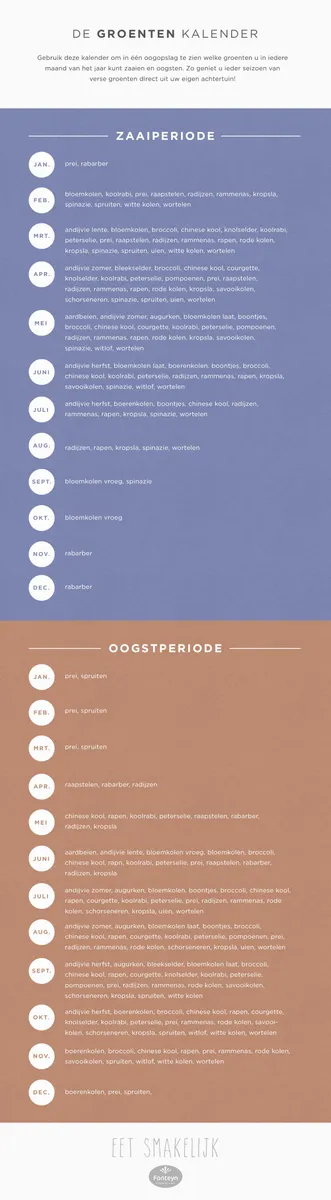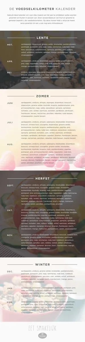 Ontdek met deze overzichtelijke kalender welke groenten en vruchten in seizoen zijn. Door seizoensbewust van fruit en groente te genieten, beperk je de voedselkilometers. Op deze manier heb je altijd de meest verse groenten, bespaar je geld én eet je ook nog eens milieubewust!